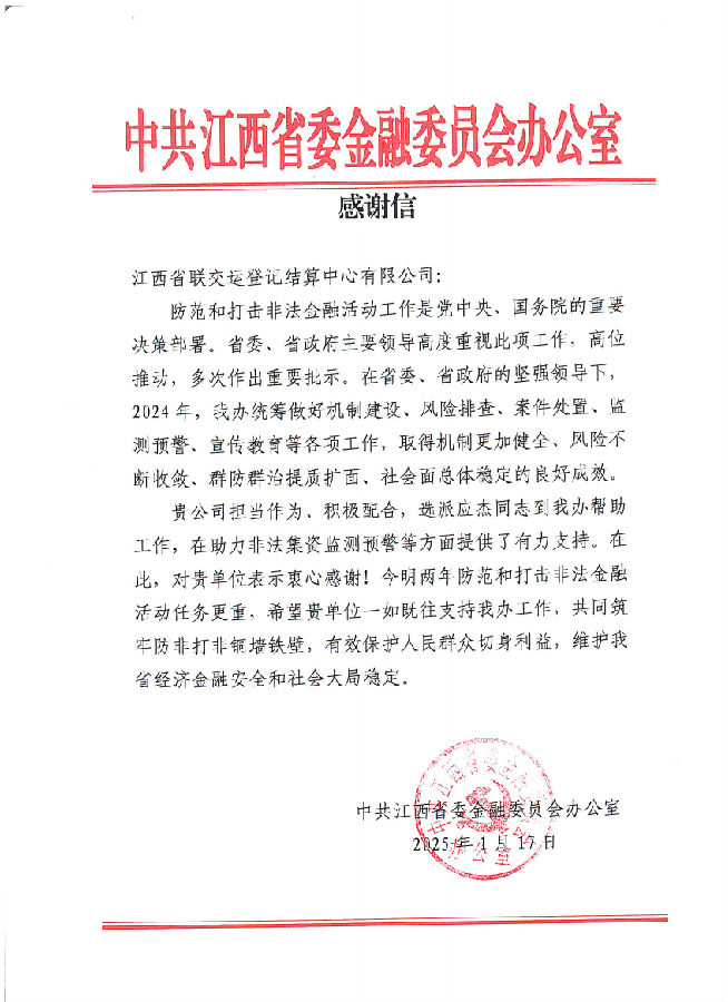 近日,江西聯(lián)交運連續(xù)收到來自中共江西省委金融委員會辦公室和中國物流與采購聯(lián)合會大宗商品流通分會發(fā)來的感謝信,分別對公司多年以來持續(xù)服務(wù)并建設(shè)運營好“贛金鷹眼”江西省非法集資監(jiān)測預(yù)警平臺,助力我省防范和處置非法集資監(jiān)測預(yù)警以及在培育大宗商品新質(zhì)生產(chǎn)力、推進供應(yīng)鏈創(chuàng)新與應(yīng)用等方面做出的積極貢獻表示表達肯定和感謝。