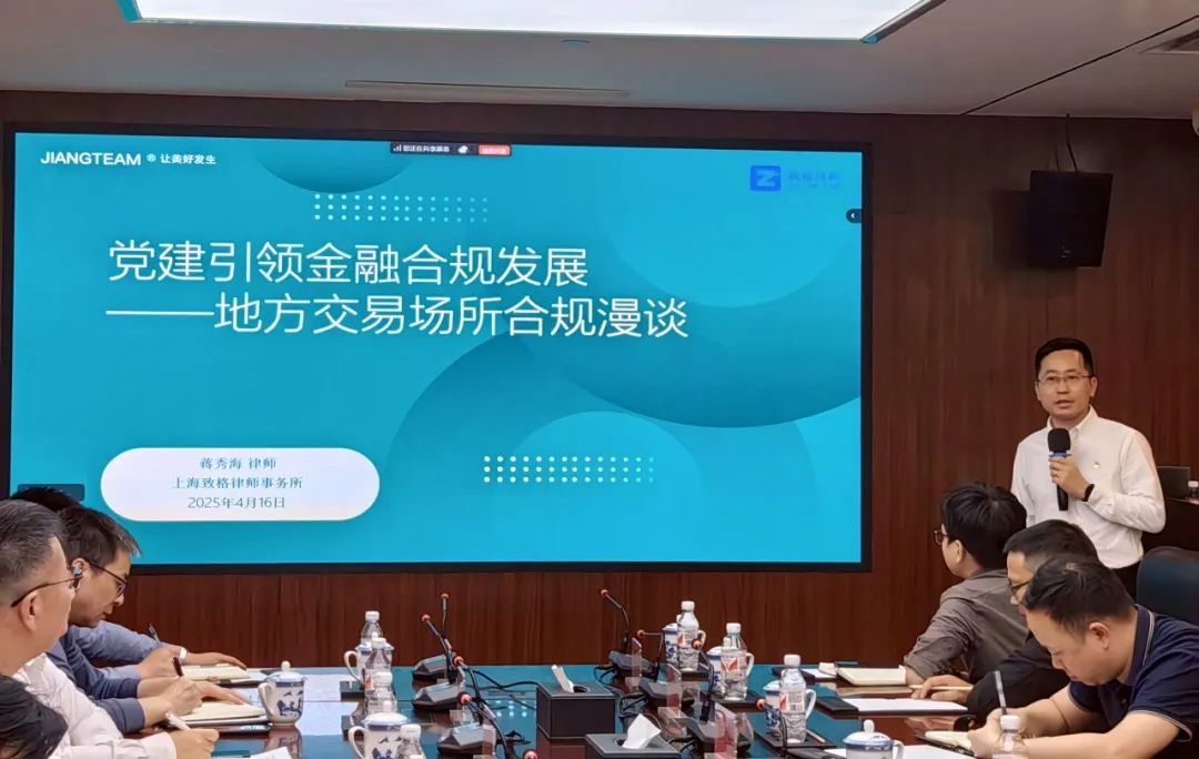 隨后,蔣秀海律師以《黨建引領(lǐng)金融合規(guī)發(fā)展——地方交易場所合規(guī)漫談》為題進行專題分享交流,對地方交易場所行業(yè)相關(guān)法律法規(guī)和監(jiān)管政策進行專業(yè)透析解讀,對地方交易場所發(fā)展定位和方向提出見解與思考,重點對地方交易場所如何加強合規(guī)風(fēng)控建設(shè)以進一步筑牢安全穩(wěn)定經(jīng)營發(fā)展防線分享了諸多具有較強針對性和實用性的意見和建議。在認(rèn)真聆聽蔣秀海律師分享后,線上、線下參會單位通過現(xiàn)場提問及線上咨詢等方式積極參與交流研討,蔣秀海律師一一進行了專業(yè)詳細(xì)的解答。參會代表紛紛表示,本次會議組織工作嚴(yán)謹(jǐn)周密,黨建學(xué)習(xí)和交流研討內(nèi)容兼具專業(yè)深度與實踐價值,會議不僅有效拓展了行業(yè)視野、創(chuàng)新了發(fā)展思維,更為交易場所搭建了高規(guī)格的交流合作平臺。