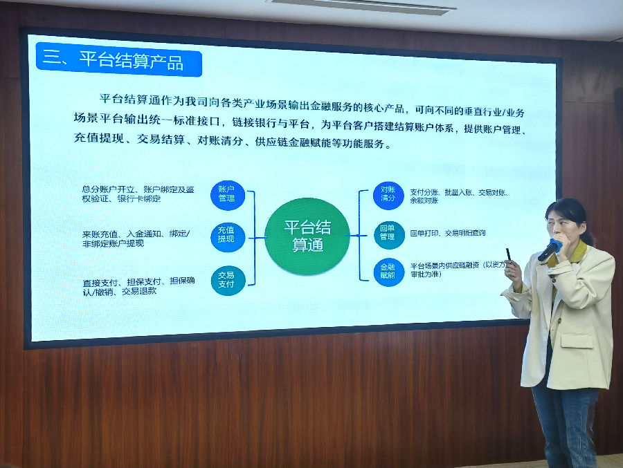 之后,市場總監(jiān)熊保明對平臺結(jié)算通產(chǎn)品進行了詳細介紹。他介紹到,平臺結(jié)算通產(chǎn)品可為相關(guān)產(chǎn)業(yè)平臺和供應(yīng)鏈核心企業(yè)/平臺提供基于第三方的統(tǒng)一賬戶管理和結(jié)算體系,滿足多類線上產(chǎn)業(yè)平臺的資金存管、實時結(jié)算、賬戶管理等共性需求。目前公司已對接上線和正在對接多家重點產(chǎn)業(yè)平臺,下一步將重點向我省“2+6+N”重點產(chǎn)業(yè)群推廣應(yīng)用。最后,綜合管理部技術(shù)主管徐波從技術(shù)角度出發(fā),對平臺結(jié)算通產(chǎn)品開發(fā)管理思路等進行了介紹,并表示將持續(xù)做好技術(shù)保障工作,為公司“結(jié)算+科技”發(fā)展貢獻更多技術(shù)力量。