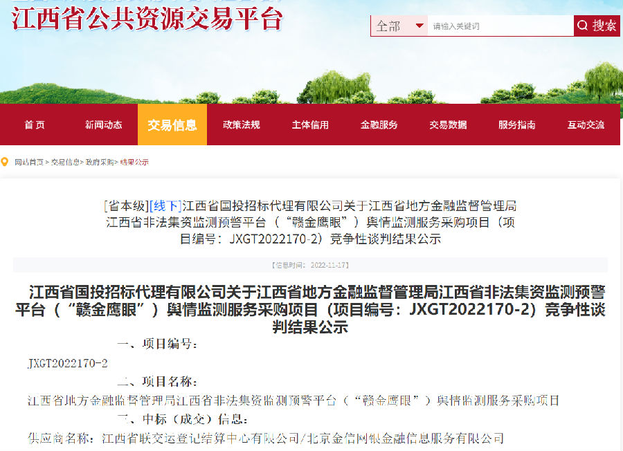 繼連續(xù)兩年中標江西省非法集資監(jiān)測預(yù)警平臺(“贛金鷹眼”)運維服務(wù)項目后,近日,江西聯(lián)交運又中標江西省非法集資監(jiān)測預(yù)警平臺(“贛金鷹眼”)輿情監(jiān)測服務(wù)項目。