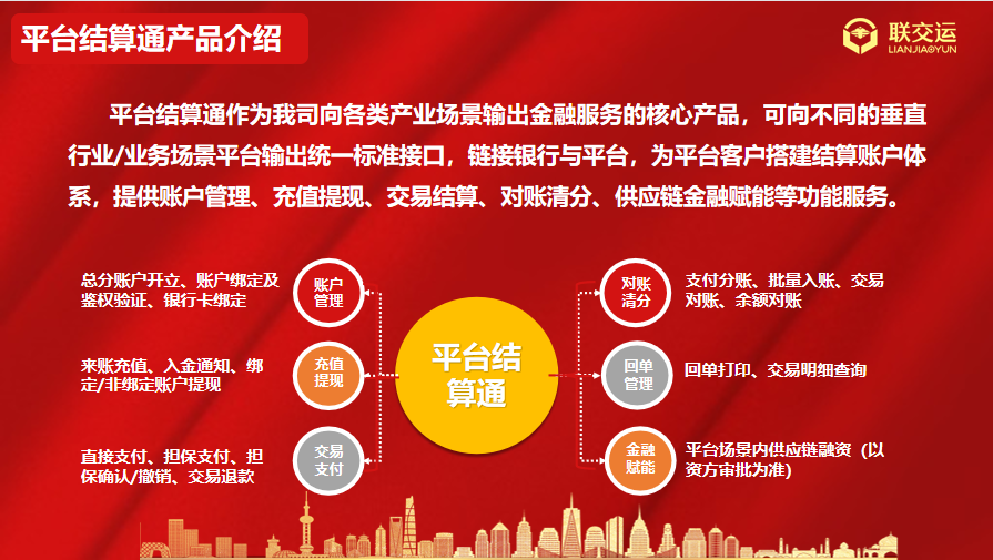 平臺結(jié)算通是公司沉心運營8年多來,不斷優(yōu)化升級集中登記結(jié)算管理服務(wù)的各項功能體驗和各類場景服務(wù)輸出,重點建設(shè)打造的為地方交易場所及多類型垂直行業(yè)/業(yè)務(wù)場景提供全鏈路交易資金“收+管+付”的綜合服務(wù)解決方案。平臺結(jié)算通可滿足地方交易場所及各類B2B、B2C交易平臺的資金存管、實時結(jié)算、賬戶管理等共性需求,包括但不限于提供總分賬簿開立、多渠道充值提現(xiàn)、擔保交易支付、批量對賬清分、回單打印查詢、供應(yīng)鏈金融賦能等一體化資金結(jié)算和賬戶管理服務(wù)。