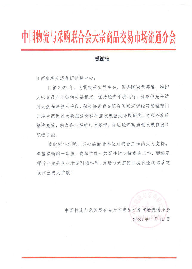 新春前夕,江西聯(lián)交運先后收到來自中國物流與采購聯(lián)合會大宗商品交易市場流通分會和中共江西省委金融委員會辦公室發(fā)來的感謝信,分別對公司長期以來服務(wù)并推動大宗行業(yè)高質(zhì)量發(fā)展及擔當作為、精準助力為我省防范和處置非法集資工作做出的積極貢獻表示表達充分肯定和感謝。