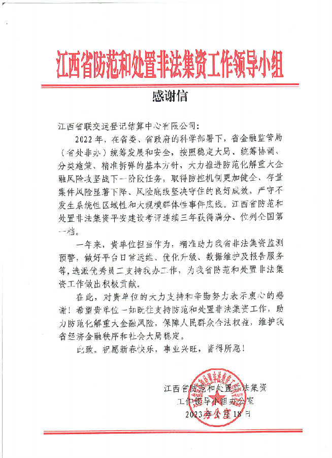 新春佳節(jié)來臨之際,江西聯(lián)交運連續(xù)收獲兩封來自江西省防范和處置非法集資工作領(lǐng)導小組辦公室和中國物流與采購聯(lián)合會大宗商品交易市場流通分會的《感謝信》,分別對公司長期以來助力我省防范和處置非法集資工作,保障地方金融穩(wěn)定以及協(xié)助維護大宗商品產(chǎn)業(yè)鏈供應(yīng)鏈穩(wěn)定,促進實體經(jīng)濟高質(zhì)量發(fā)展等方面作出的積極貢獻表達肯定和真誠感謝。